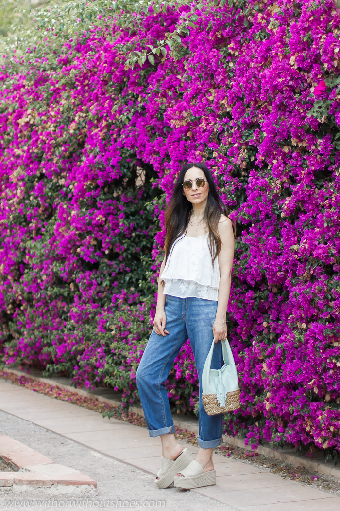 Para combinar con ellos he elegido un top de dos capas fluido en color blanco, unas cuñas de rafia y un bolso de la marca española Blover recién llegado a casa que es una preciosidad hecho de palma y cuero en color menta, una mezcla inesperada que queda genial.